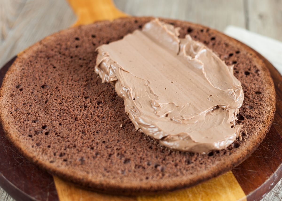 - Rellenar con el merengue suizo de caramelo, una capa de bizcocho hasta hacer los 3 pisos, y luego cubrir completamente con el merengue suizo de chocolate.
