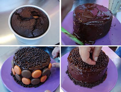Dejar enfriar y cubrir con chocolate de cobertura (tipo nutella, o chocolate fundido), y pegar los macarrons alrededor de la tarta, colocar las bolitas de chocolate en la parte alta de la tarta y dejar en la nevera media hora.