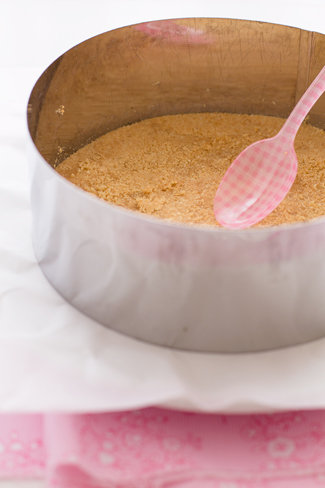 Sobre un plato, ponemos una hoja de papel de hornear, sobre ella un aro de emplatar de 16cm sin base y cubrimos toda la base de la tarta con la mezcla de galletas y margarina. Presionamos bien con una cuchara. Reservamos en la nevera.