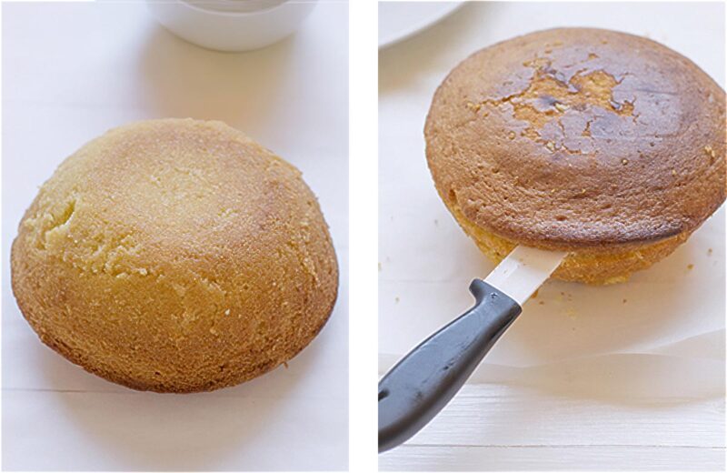 - Cortamos la parte superior del bizcocho y la retiramos (no vamos a utilizarla pero podemos guardar el bizcocho que nos sobre para preparar cake pops por ejemplo).