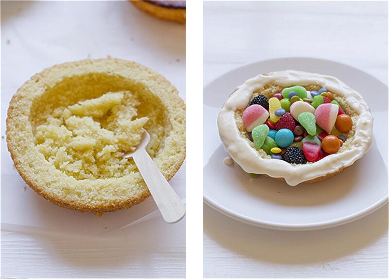- Rellenamos ese hueco con chucherías, con una cuchara pequeña cubrimos el borde del bizcocho con crema de queso.