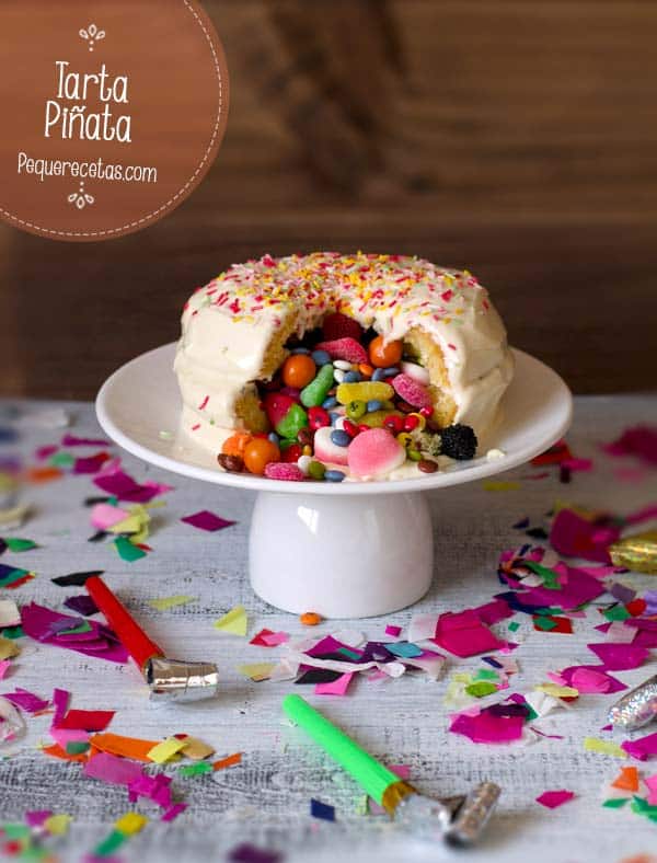 Jugosa, esponjosa y de fácil preparación son las principales características de esta rica tarta piñata rellena de chucherías, cuando la presentéis en la mesa todos se sorprenderán porque su exterior no deja ver la sorpresa que guarda dentro y cuando deis el primer corte ¡una explosión de golosinas hará las delicias de los más pequeños!.