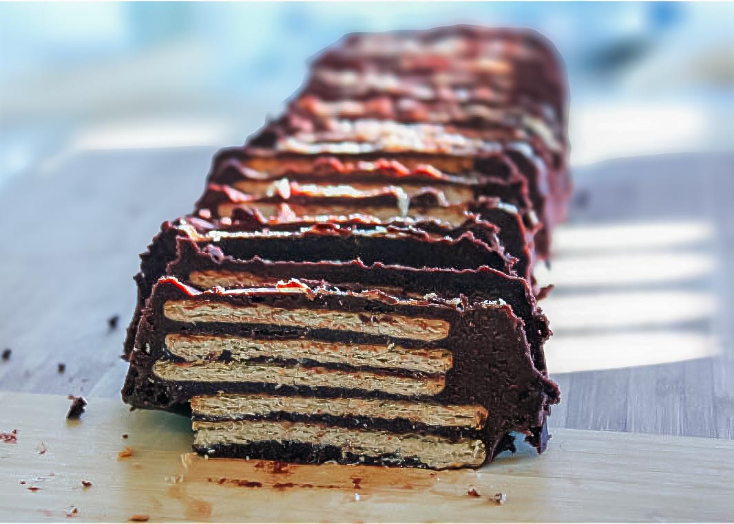 La primera es la famosa tarta galletas alemana o Keller Kuchen (en alemán, tarta del sótano) y está hecha a base de galletas rectangulares, huevos, chocolate cobertura, mantequilla, azúcar y cacao en polvo. Como podéis ver en la imagen el chocolate queda mezclado con las galletas y más sólido que en la segunda versión de abajo.