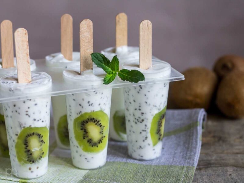 - Decorar con kiwi: Coloca las rodajas de kiwi de forma decorativa sobre la crema.