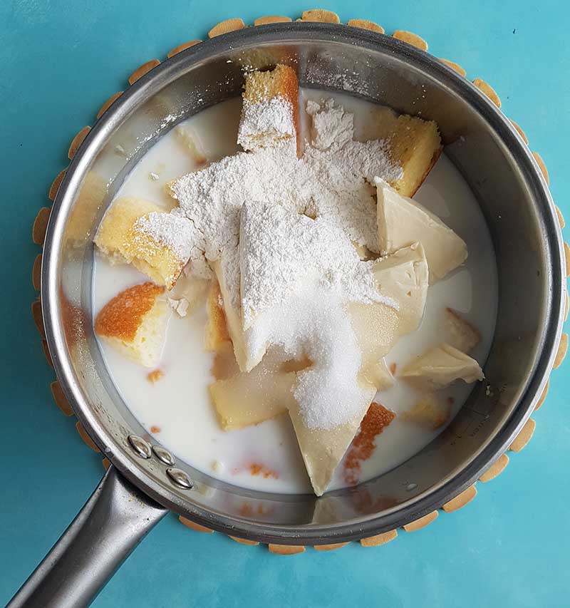 - Ponemos un cazo al fuego con los quesitos, los sobaos desmenuzados con las manos, la leche, los dos sobres de cuajada y el azúcar.