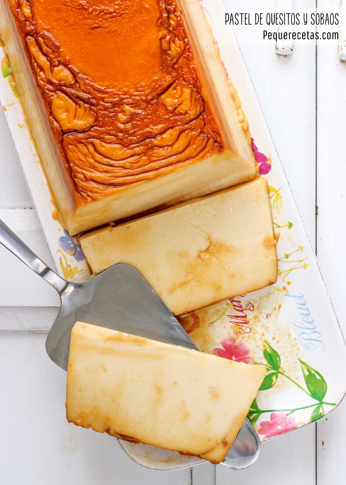 Nosotros hoy hemos preparado la receta fácil sin base de sobaos, que queda más tipo flan, pero si queréis darle más apariencia de pastel o tarta solo tenéis que poner por encima una base de sobaos para que al volcarlo quede por debajo.