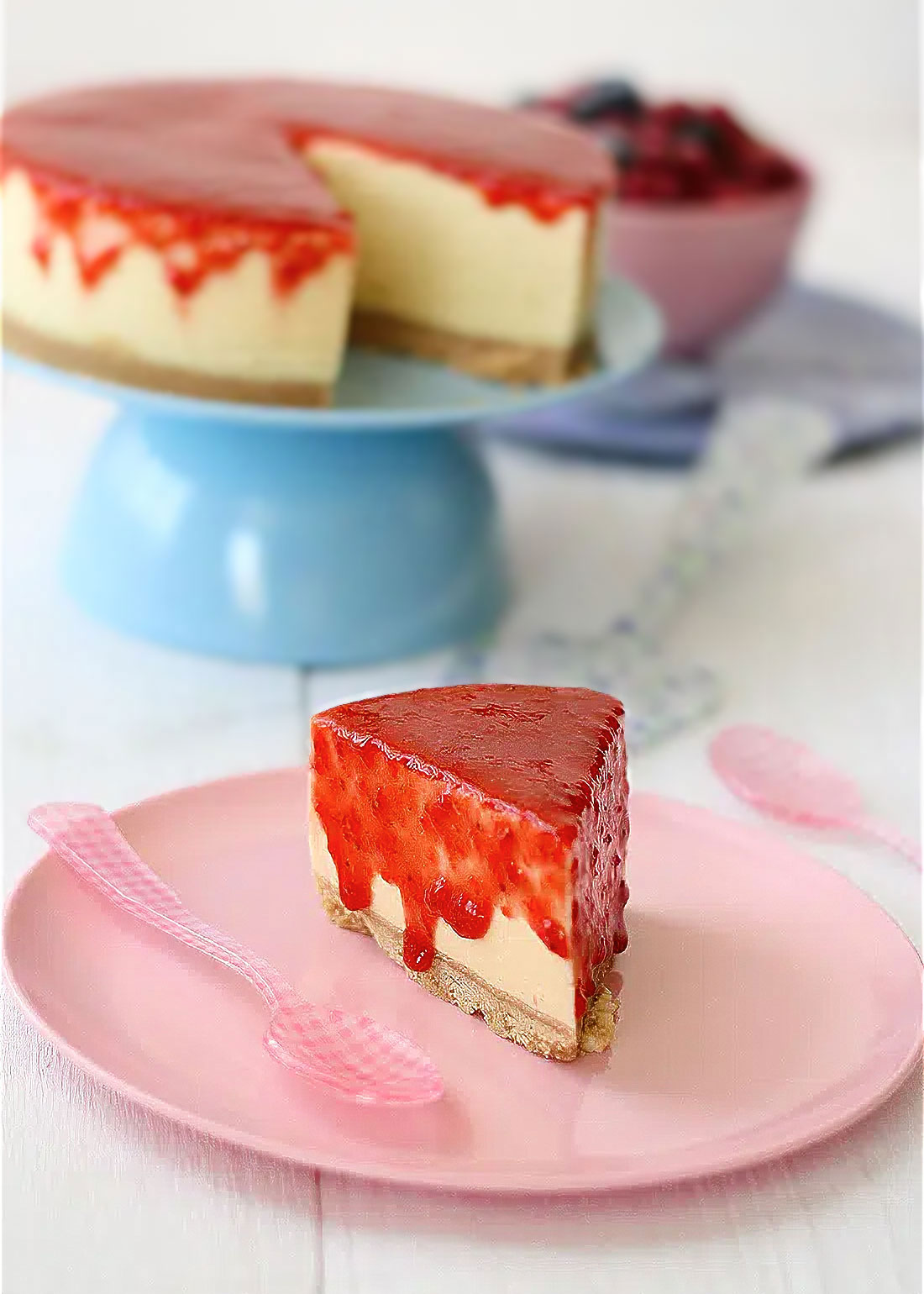 Ingredientes: 200 g de yogur griego; 900 g de queso Philadelphia; 3 huevos; 250 g de azúcar; zumo de medio limón; 3 cucharadas soperas de harina de repostería; una pizca de vainilla; para la cobertura: 300 g de frambuesas o fresas (pueden ser congeladas); zumo de medio limón; una hoja de gelatina; 3 cucharadas soperas de azúcar