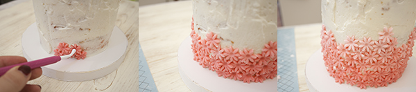 Cuando tenemos todas las flores cortadas, sacamos la tarta de la nevera y comenzamos a decorar. Empezamos de la base con las flores más oscuras, cogemos cada flor con la punta del bolillo, presionando un poquillo para marcarla, y la pegamos en la tarta haciendo un ligera presión. Vamos pegando una flor al lado de la otra y procuramos que la línea de división entre un color y otro no nos quede recta si no que queden algunas flores más arriba que otras.