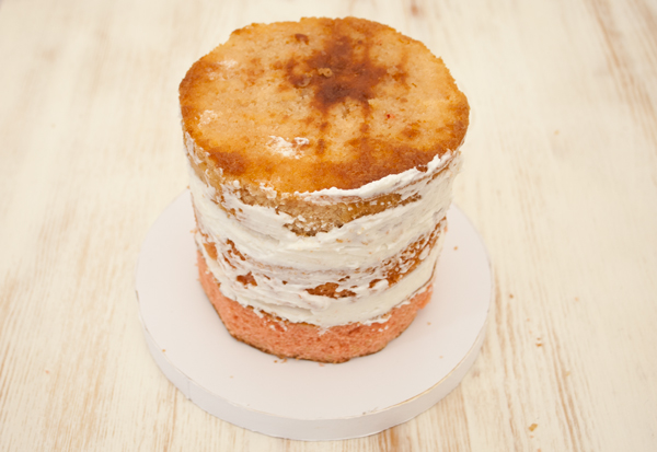 Pasamos al montado de la tarta. Podéis usar si queréis almíbar para bañarla, pero sin exagerar porque nos tiene que quedar firme. Ponemos bastante frosting entre capa y capa y llevamos a la nevera por al menos 20 minutos para que se endurezca un poquito.