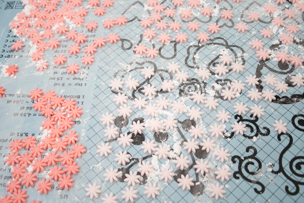 Cogemos aproximadamente una quinta parte del fondant y lo teñimos de rosa oscuro. Estiramos con el rodillo a unos 2 o 3 mm. de espesor y cortamos muchas flores, al menos 20.