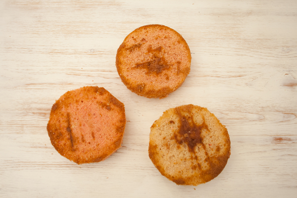 Como os decía, he usado 3 bizcochos de 15 cm. de diámetro, cada uno teñido con una tonalidad de rosa diferente. Una vez que se han enfriado bien, cortamos un poco la cubierta para que queden planos y absorban un poco el frosting.