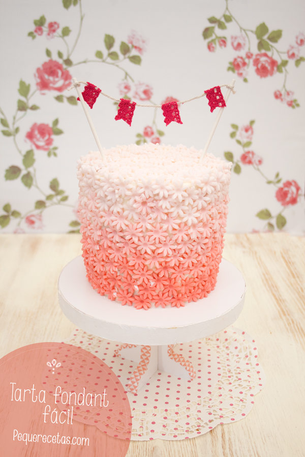 Lo que hace a esta tarta tan especial es el sombreado, el degradé del color rosa desde la base hacia la cima que le da un aire muy elegante pero a la vez cálido. Yo he completado la decoración con un cake topper que he hecho con dos bastoncitos, hilo de algodón y una cinta de encaje con la que he hecho los banderines. Una decoración muy sencilla que de cualquier manera podéis reemplazar con flores frescas, una vela o lo que se os ocurra a vosotros.
