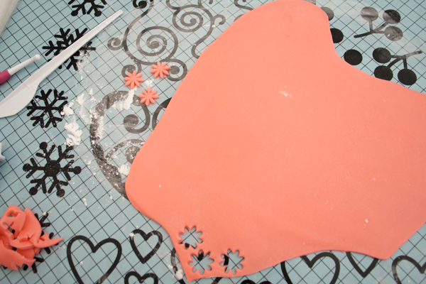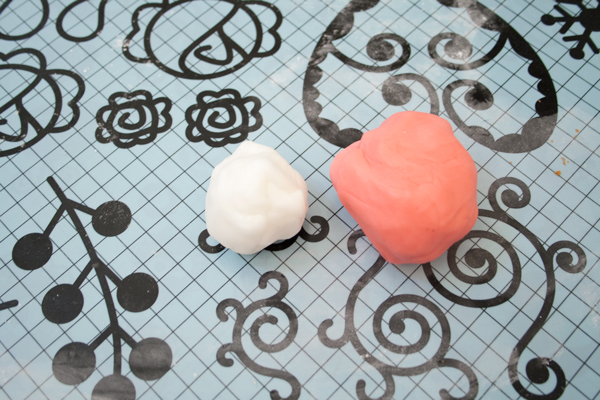 Al excedente de fondant rosa que nos ha quedado, le agregamos un poco de fondant blanco, amasamos bien y volvemos a estirar para cortar más flores.