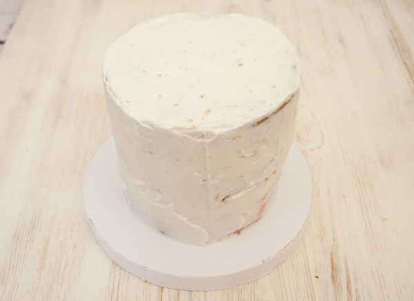 Cubrimos completamente la tarta con el frosting, ayudándonos con una espátula larga. Si hace falta, haced una primera capa fina de frosting, dejad reposar en la nevera por 15 minutos y completad con una segunda capa. No hace falta que quede perfecto, ya que las flores cubrirán cualquier imperfección. Llevad a la nevera mientras preparamos las flores.