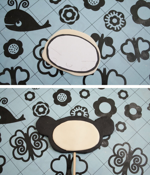 - Estiramos el fondant negro un poco grueso, de unos 7 mm. de espesor, apoyamos encima la carita de Pucca y cortamos por todo el borde con el cuchillo.