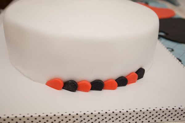 - Alternando colores y formas, decoramos todo el borde de la tarta, en esta foto de la tarta fondant terminada se ve perfectamente: