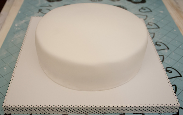 • Para empezar, cubrimos la tarta con la crema elegida que nos servirá para que se pegue el fondant y luego forramos la tarta con el fondant blanco, que habremos estirado con el rodillo a 5 mm. de espesor. En el tutorial de la Tarta de Mickey del que os he hablado antes encontraréis la explicación detallada para forrar la tarta.
