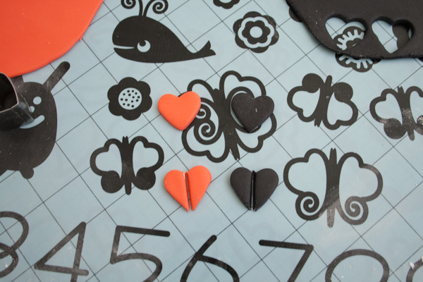 - Para ello, estiramos el fondant rojo y negro, cogemos el cortante en forma de corazón y cortamos muchos corazones de los dos colores y luego los cortamos al medio con el cuchillo: