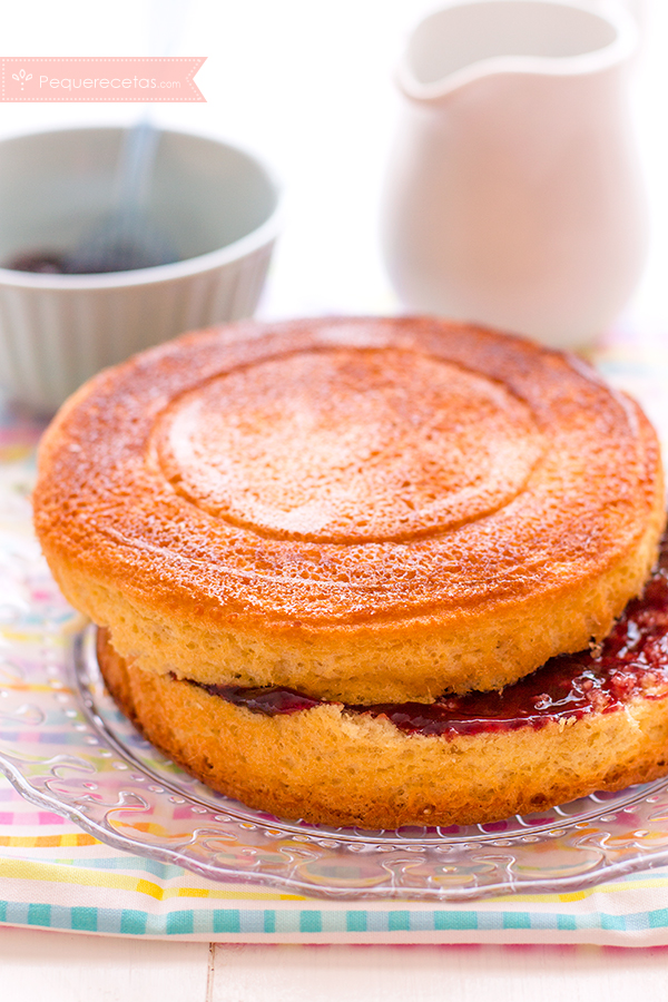 - Vierte la mezcla en el molde y hornea durante 20-25 minutos. Deja enfriar y corta el bizcocho en dos capas.