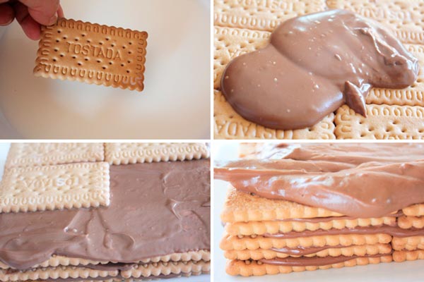 Guardamos en el frigorífico, podemos prepararla incluso el día anterior. Una vez fría podéis adornar al gusto vuestra tarta de galletas con crema de chocolate.