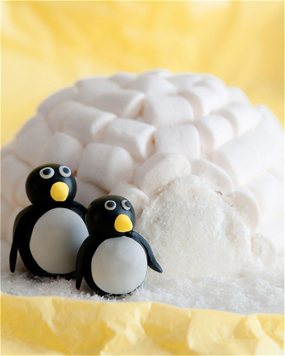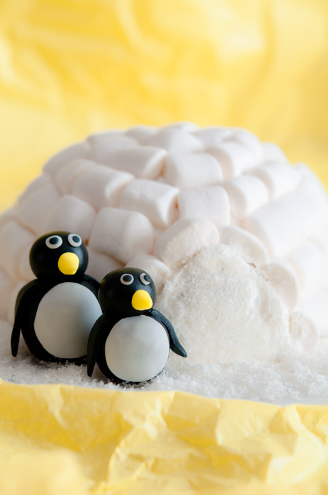 - Finalmente, hacemos unos pingüinos con fondant o con mazapán y decoramos con ellos nuestro iglú.