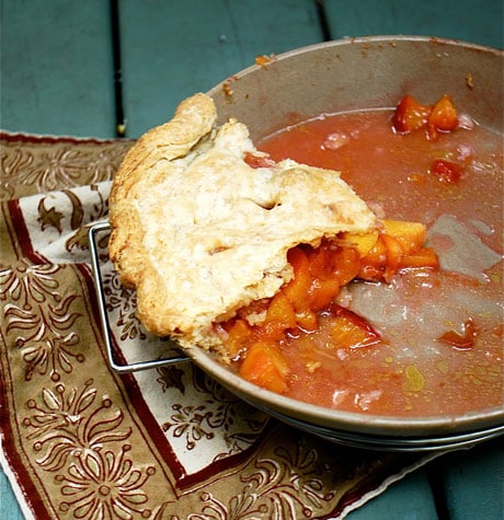 - Horneamos durante unos 60-70 minutos, o hasta que la masa esté bien dorada y los jugos de los melocotones se hayan espesado.