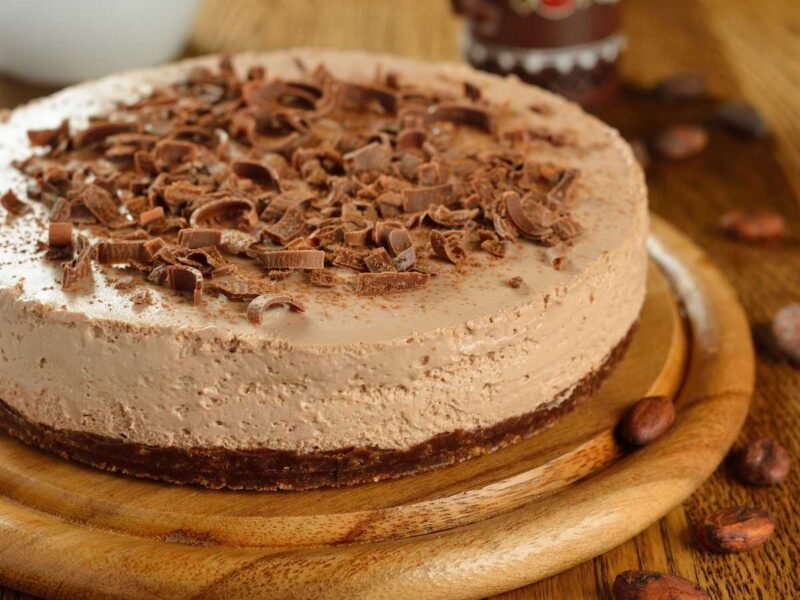 - Decoración final: Cuando la tarta esté bien fría y firme, desmóldala con cuidado y decora con virutas de chocolate, cacao en polvo o trocitos de avellanas, según prefieras. ¡Y ya está lista para servir!