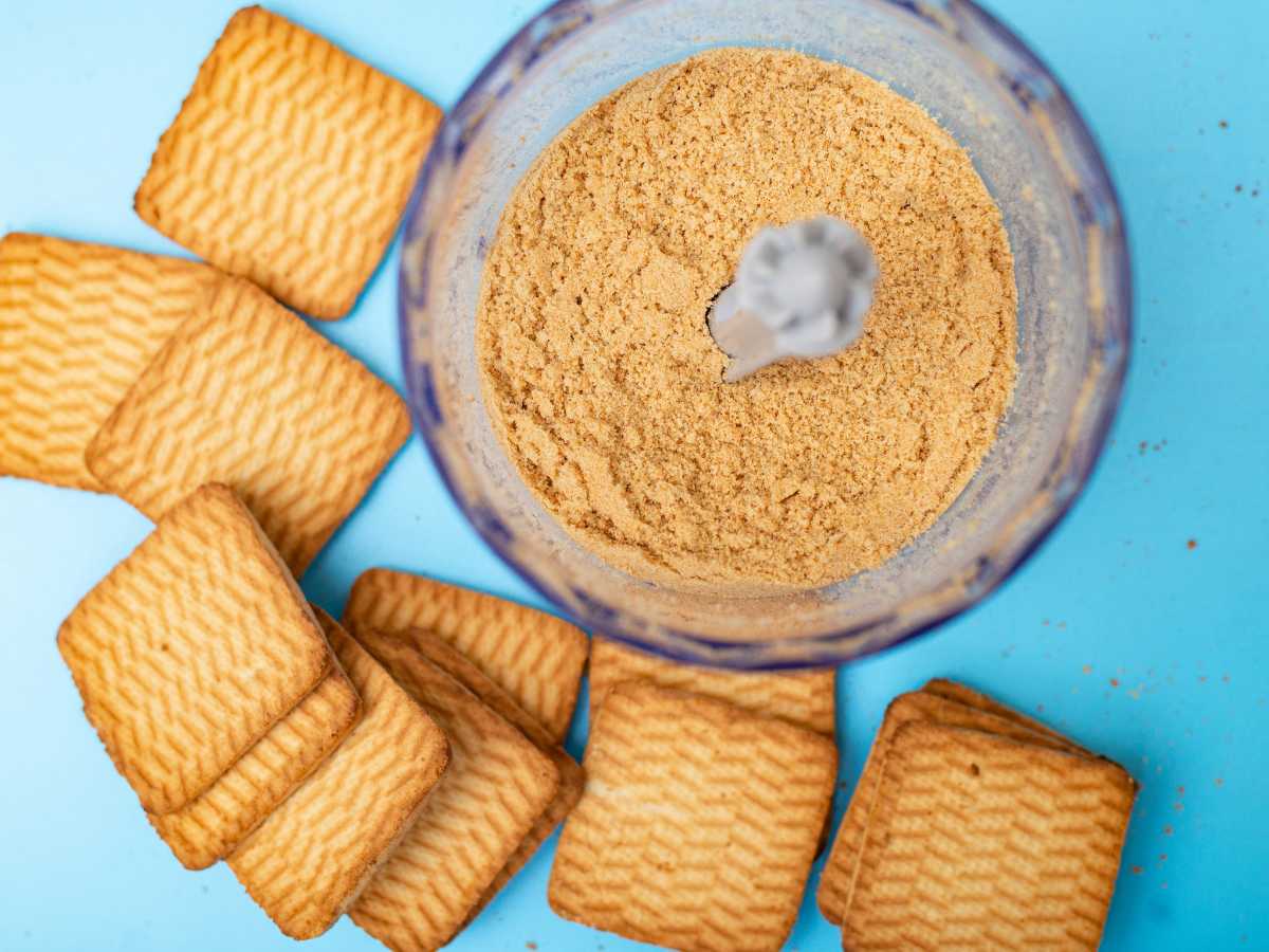 - Mezcla las galletas trituradas con la mantequilla derretida hasta obtener una pasta arenosa.