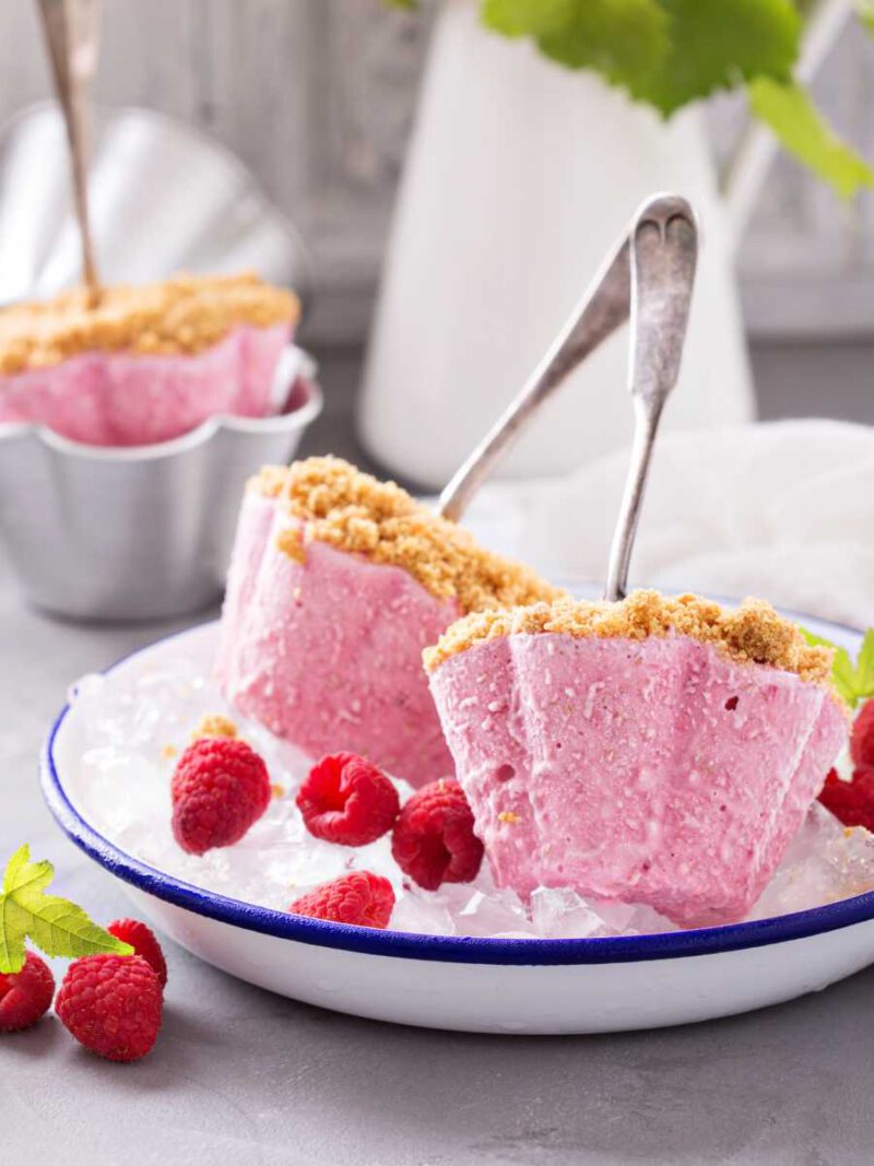 - Una vez desmoldado, sirve el helado de cheesecake con frambuesas en un plato con algunas frambuesas frescas como decoración.