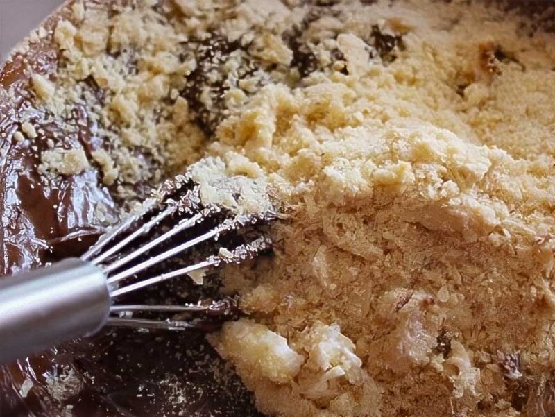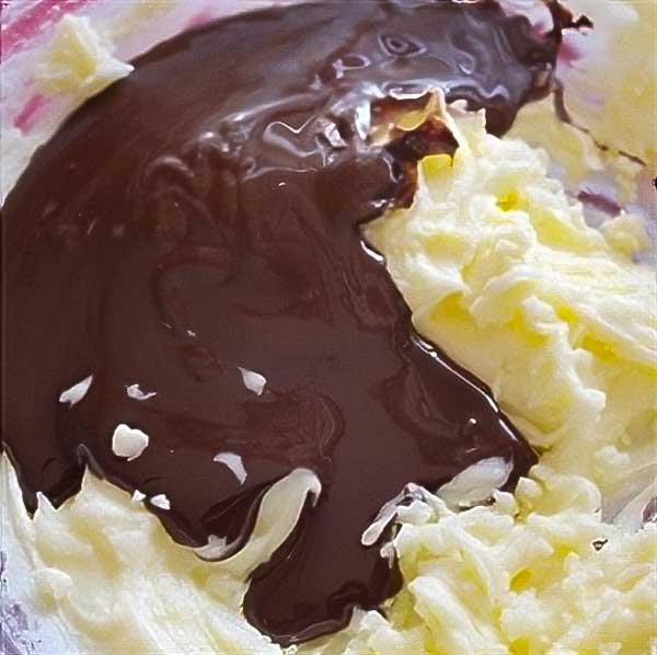 - Fundimos el chocolate al baño maría o en el microondas (una buena opción es hacerlo en la función de descongelación) y agregamos a la mantequilla.