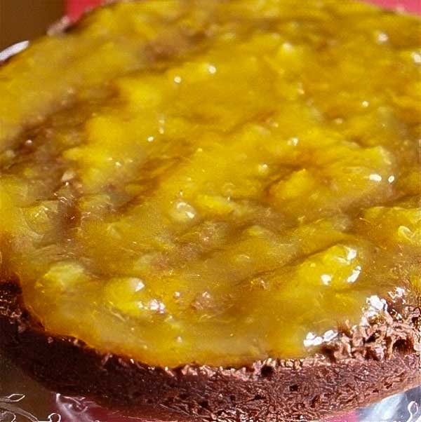 - Calentamos ligeramente la mermelada de albaricoque y cubrimos la capa inferior del bizcocho. Colocamos la otra mitad encima.