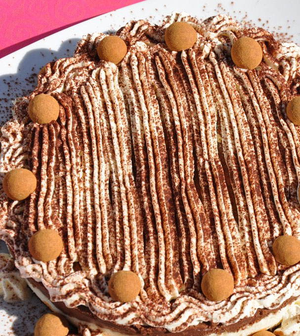 - Sacamos la tarta del frigorífico cuando haya pasado el tiempo y con ayuda de una cuchara volcamos la ganache de chocolate templada sobre ella con cuidado.