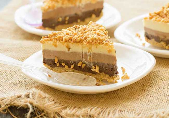 El porqué del nombre es sencillo, ya que la tarta lleva una capa de chocolate negro, una capa de chocolate con leche y una capa de chocolate blanco. Todo mezclado con nata y cuajada y sobre una base de galletas trituradas con mantequilla.