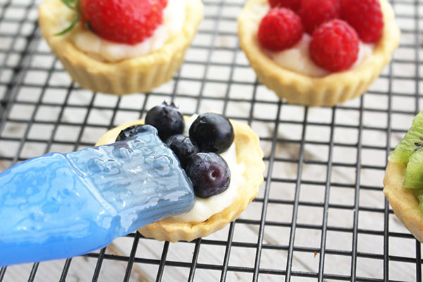 - Para terminar nuestras tartaletas de frutas rellenamos las tartaletas con la crema, ponemos por encima la fruta que más nos guste y encima pincelamos con el brillo.