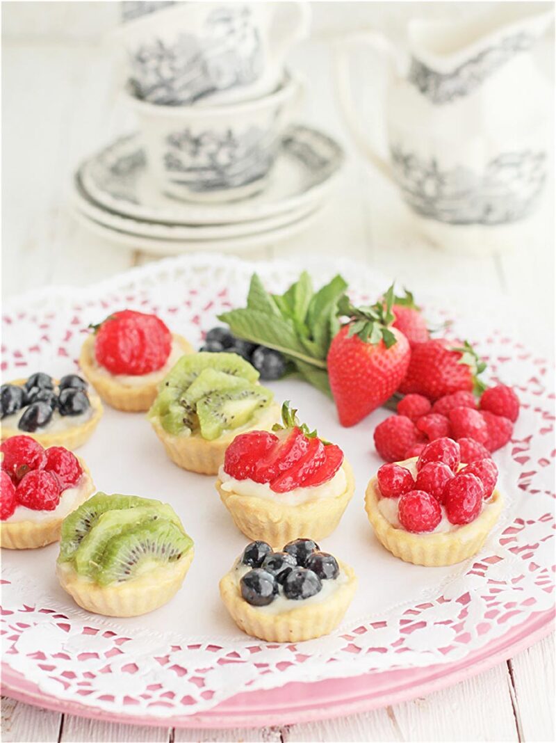 Deliciosas estas tartaletas de frutas rellenas de crema pastelera, para comer sólo de un bocado. Están tan ricas que sorprendereis a vuestros invitados cuando vengan a comer y en el postre saquéis estas pequeñas tartas de frutas.