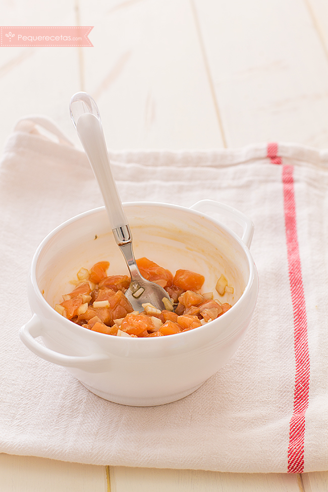 - Cortamos el salmón en trozos muy pequeños, picamos la cebolleta también en trozos muy pequeños y mezclamos junto con la salsa de soja, la salsa Worcestershire, 1 cucharada de aceite y un poquito de limón. Mezclamos bien, tapamos y dejamos reposar en la nevera 30 minutos.