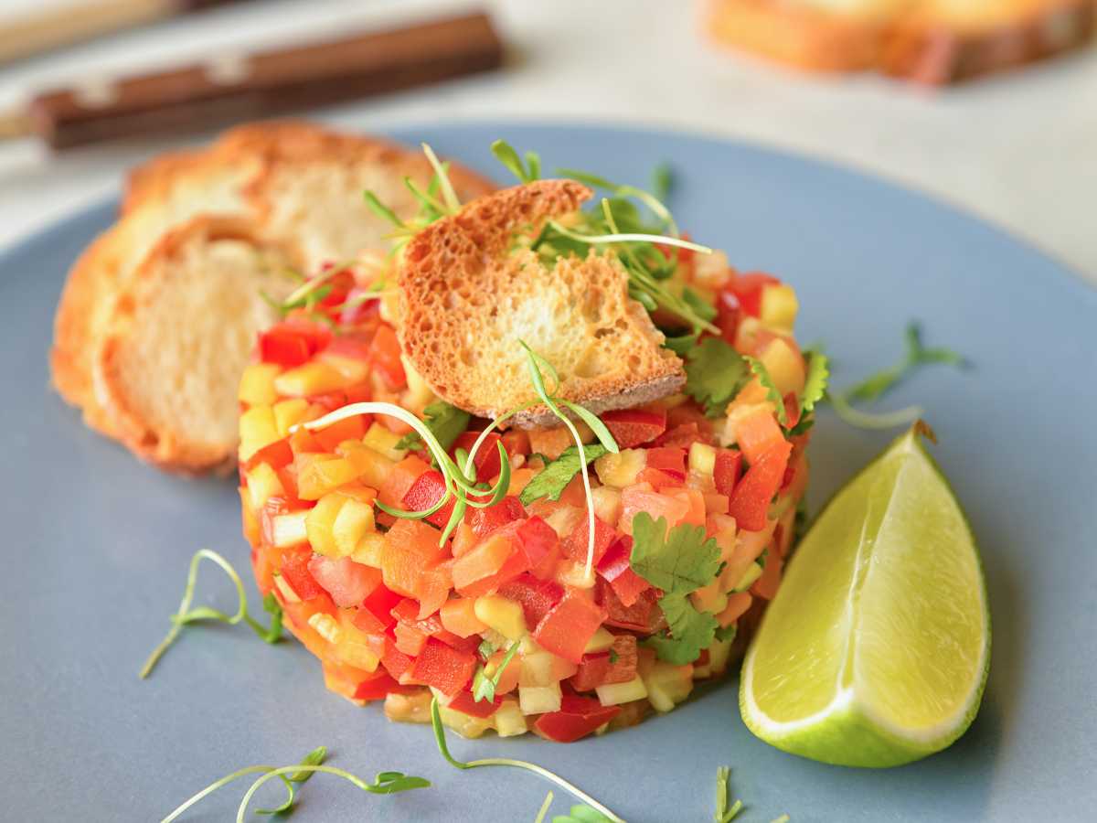 Es una versión vegana del clásico tartar de salmón o atún que todos conocemos. Básicamente son tomates cortados en dados pequeños (a los que puedes añadir otros ingredientes como pepino, remolacha o aguacate si quieres), mezclados con una vinagreta sabrosa y servidos bien frescos. Es perfecto cuando hace calor y quieres algo ligero pero con mucho sabor.