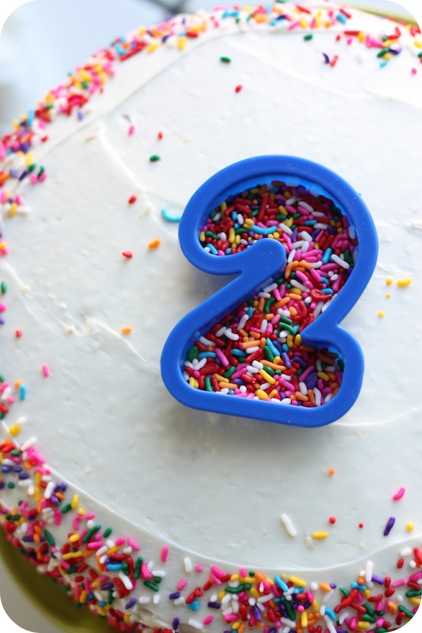 Para hacer el número necesitaréis un cortante, como en la imagen, o podéis haceros un stencil cortando a mano el número en un trozo de papel de horno, como hemos visto en la primera tarta con los topos. Espolvoreáis con sprinkles con cuidado de no saliros del borde ¡y listo!