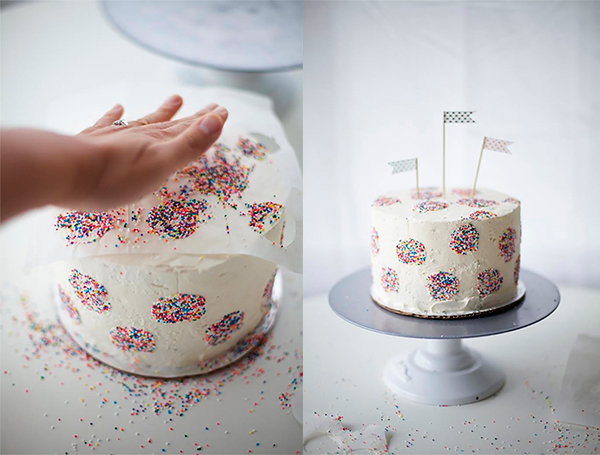 Otra idea bonita para decorar con sprinkles. De nuevo cubrimos la tarta con nata o la crema que más os guste y espolvoreamos todo alrededor, sin tener demasiado cuidado, con los sprinkles.