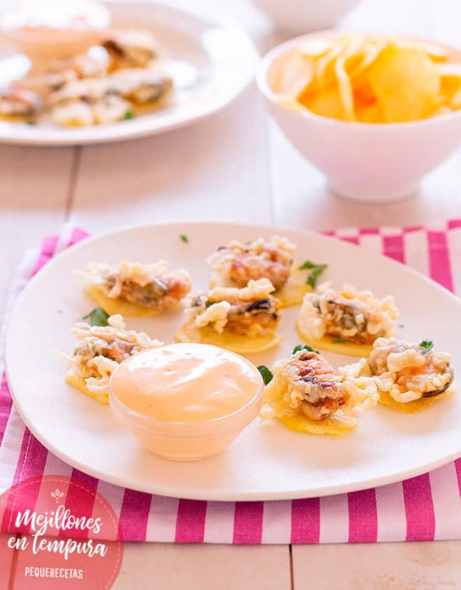 Colocamos las patatas chips con los mejillones en tempura encima de cada una y la salsa en un cuenco pequeño para mojar.