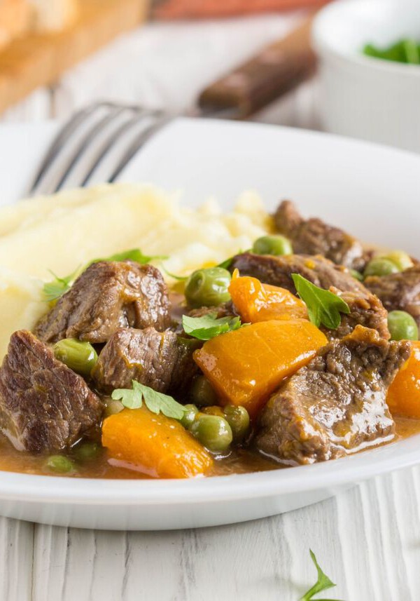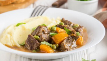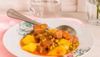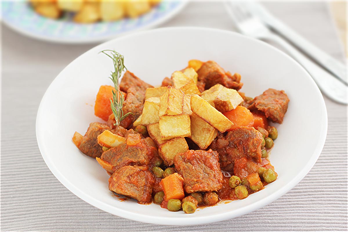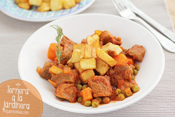 La ternera a la jardinera es un estofado de carne de ternera cocinado junto con cebolla, tomate, zanahoria y guisantes al que le incorporamos al final unos dados de patatas fritas, perfecto para toda la familia.
