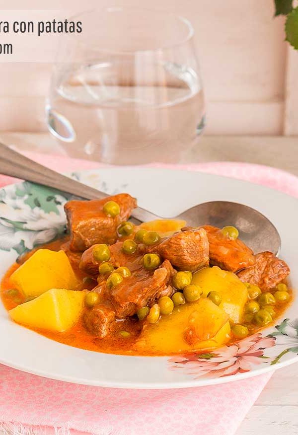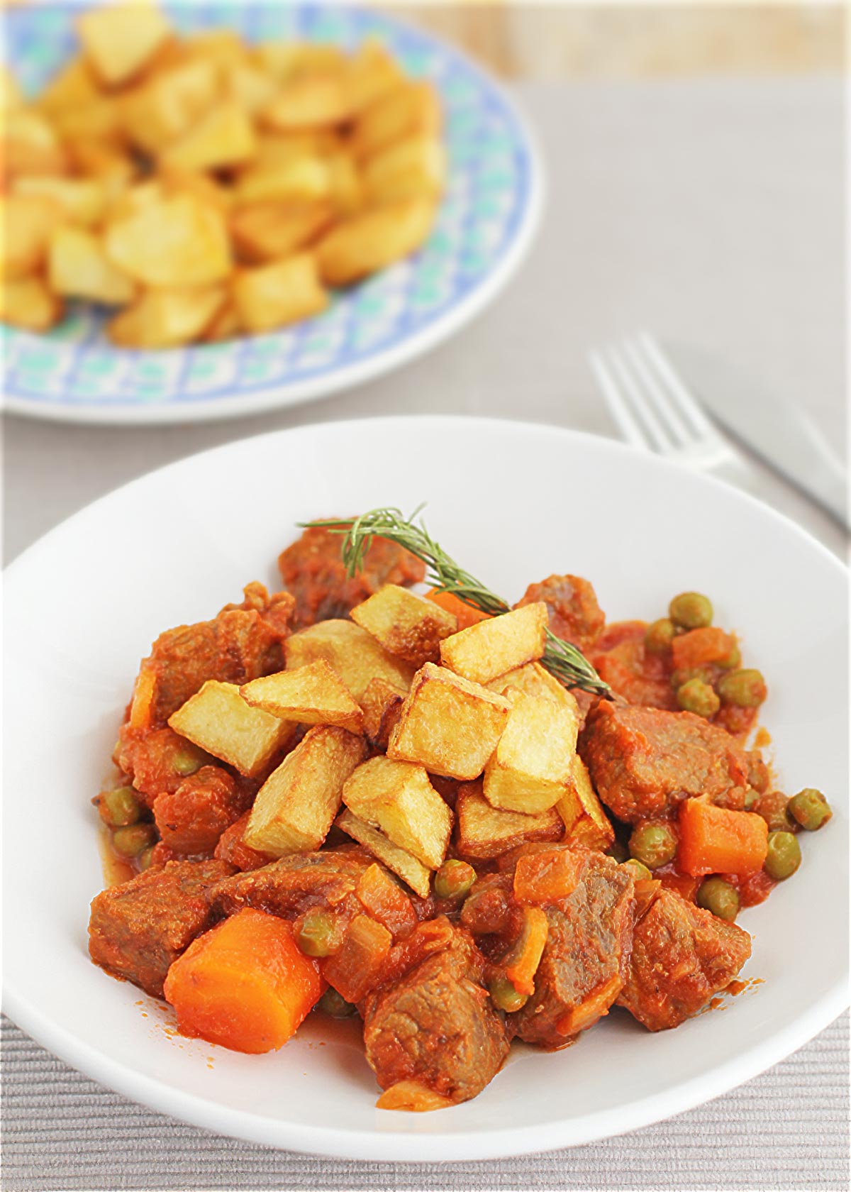 Se trata de un guiso de ternera con patatas muy tradicional, un plato elaborado a fuego lento, al “chup-chup” de la cazuela, aunque podemos hacerlo con olla a presión o incluso con Thermomix, porque por mucho que queramos, el tiempo manda la mayoría de las veces. Vosotros elegid la forma de cocinarla.