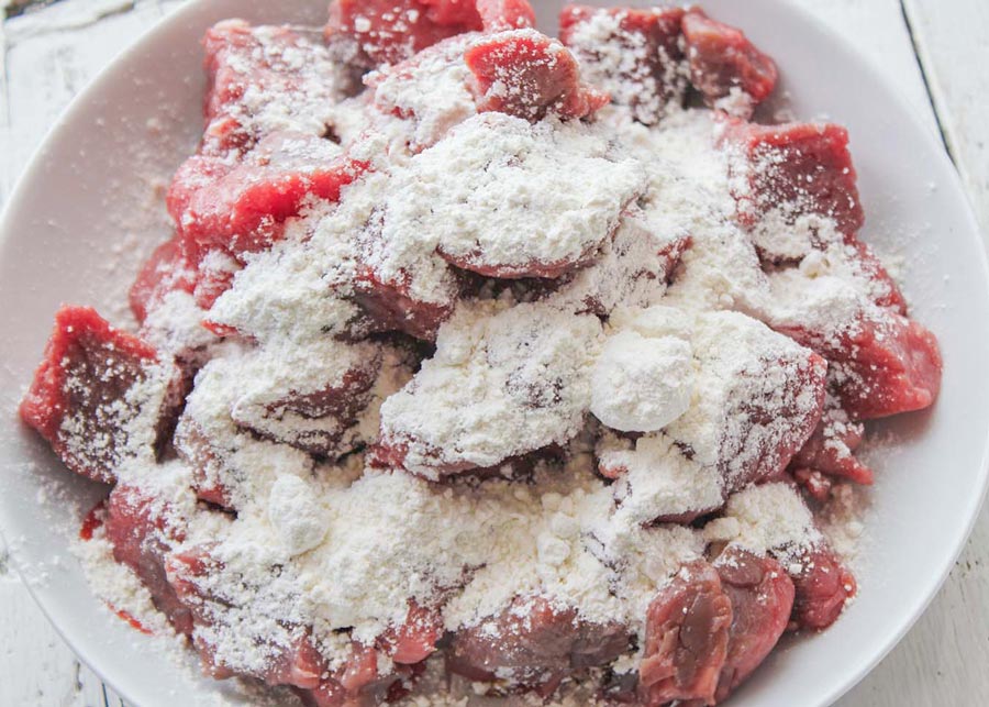 - Enharinamos los trozos de carne y doramos a fuego fuerte en una cacerola con aceite de oliva virgen extra, sacamos la carne y reservamos en un plato.