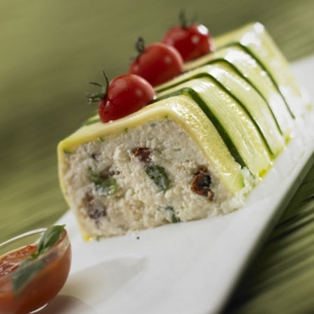 - Montar la nata y añadirla a la preparación anterior. Forrar la terrina Mastrad con las laminas de calabacín marinadas. Rellenar con la mezcla de queso y tomate y prensar suavemente para que quede compacto.