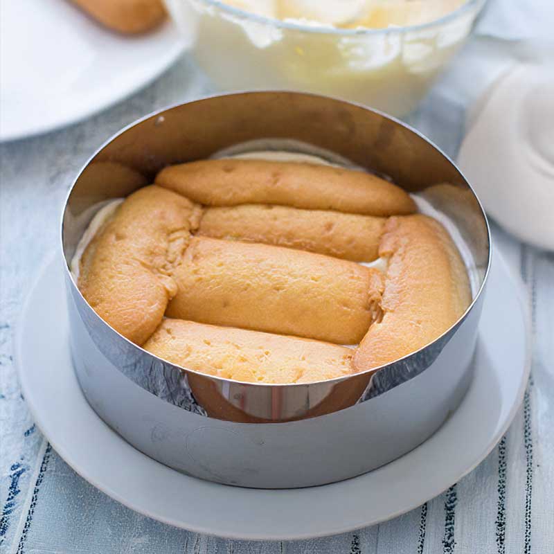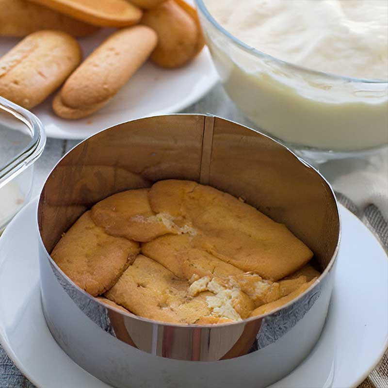 Montamos una primera capa con los bizcochos en el molde que hayamos elegido.