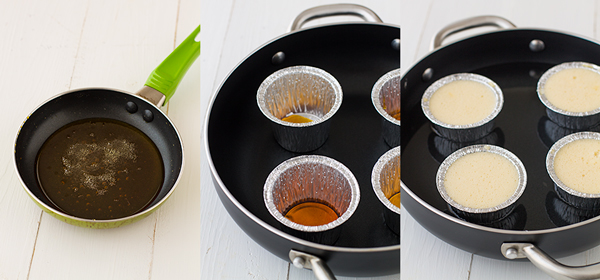 - Vertemos el caramelo dentro de las flaneras y a continuación la mezcla.