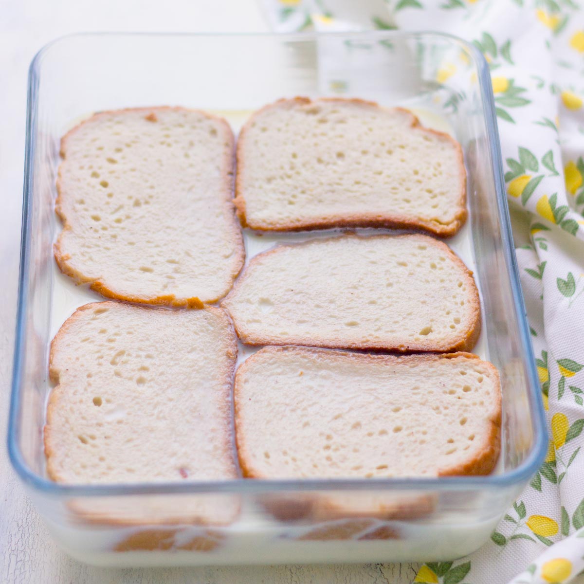 - Ponemos en una bandeja el pan de torrijas y vertemos la leche infusionada por encima.