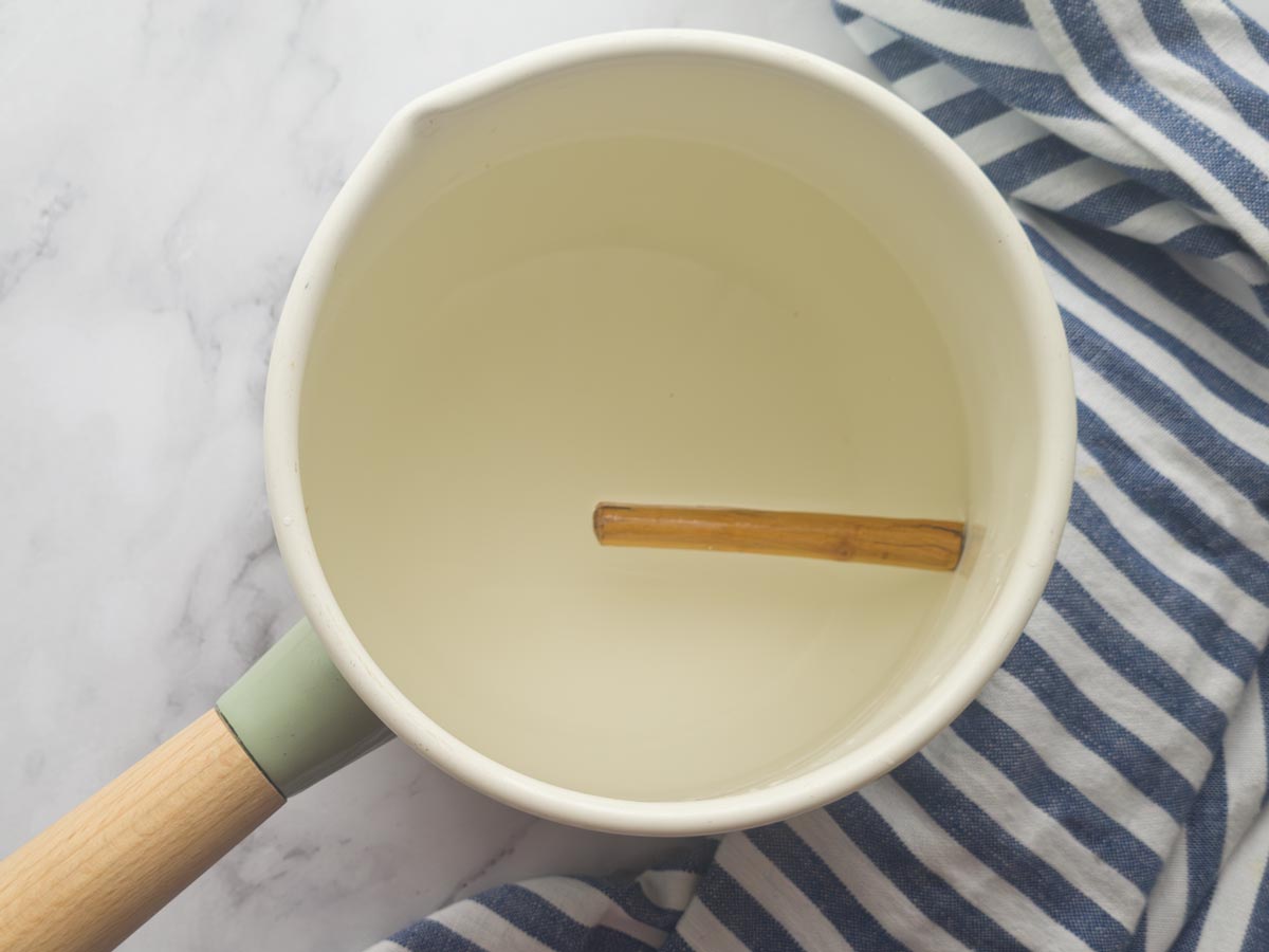 - En un cazo ponemos el agua junto al azúcar y la rama de canela (si quieres hacer más almíbar multiplica las cantidades)