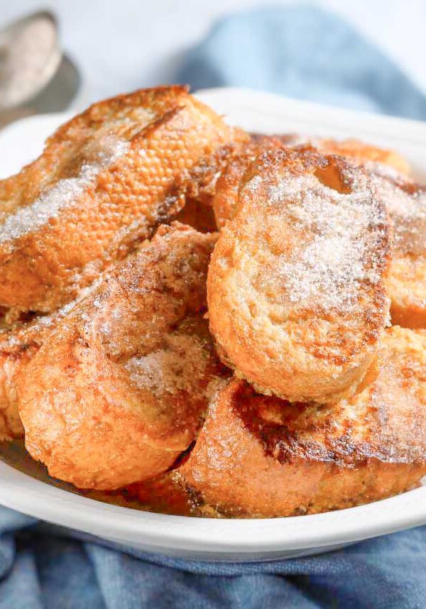 Además vamos a hacer las torrijas en freidora de aire, porque así ahorramos calorías y la preparación es más sencilla y limpia que cuando las freímos. Otra opción si quieres hacer muchas a la vez son las torrijas al horno, que también te recomendamos, aunque tardan más tiempo que las primeras.