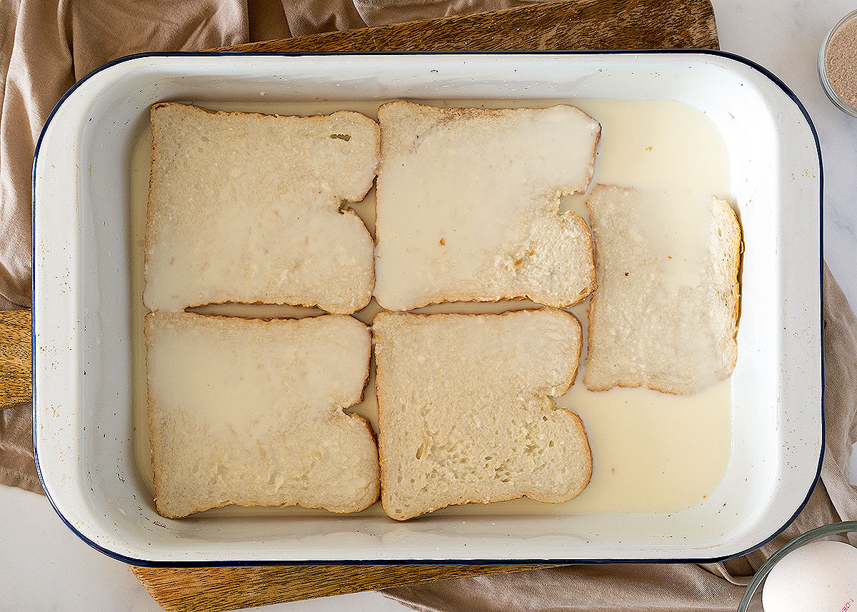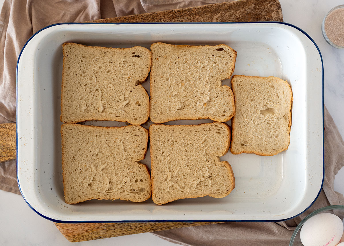 Disponemos el pan en una fuente amplia y con algo de profundidad donde nos quepan unas cuantas rebanadas.